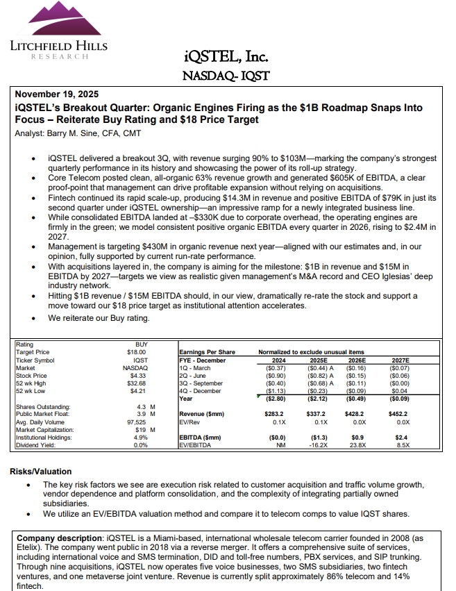 Adding credibility to IQST’s strategy, Litchfield Hills Research recently initiated coverage with a detailed report highlighting the company’s high-margin growth strategy and issuing an $18 price target. The report underscores the scalability of IQST’s diversified business model and the long-term value embedded in its AI, fintech, and telecom platforms.