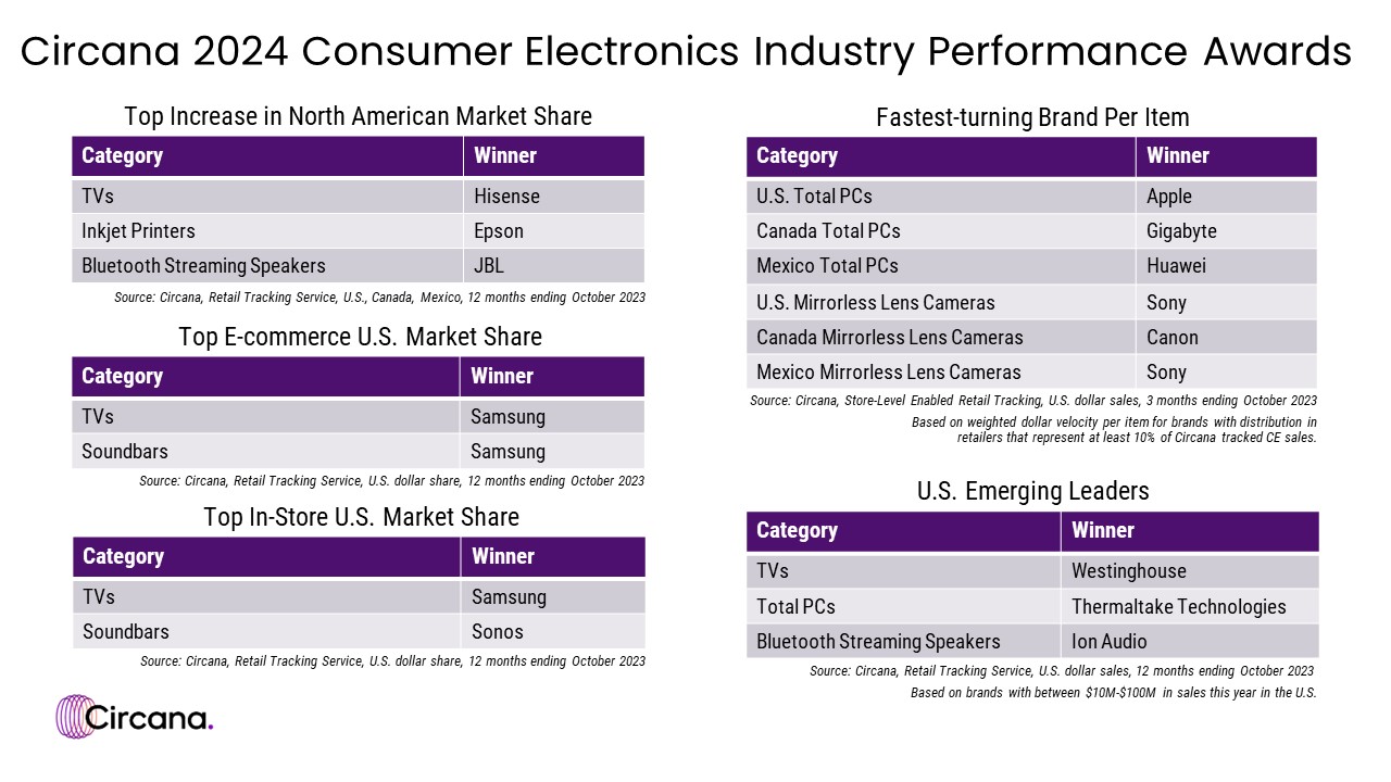 Las Vegas, NV, Jan. 08, 2024 (GLOBE NEWSWIRE) -- Jan. 8, 2023 – Circana™, the leading advisor on the complexity of consumer behavior, today announced the winners of its 2024 Consumer Electronics (CE) Industry Performance Awards. The 8th annual awards program, timed with CES, celebrates brand leaders in the consumer technology industry based on top increases in market share in North America, fastest turning brand per item in the U.S., Canada and Mexico, and top e-commerce market share gain.