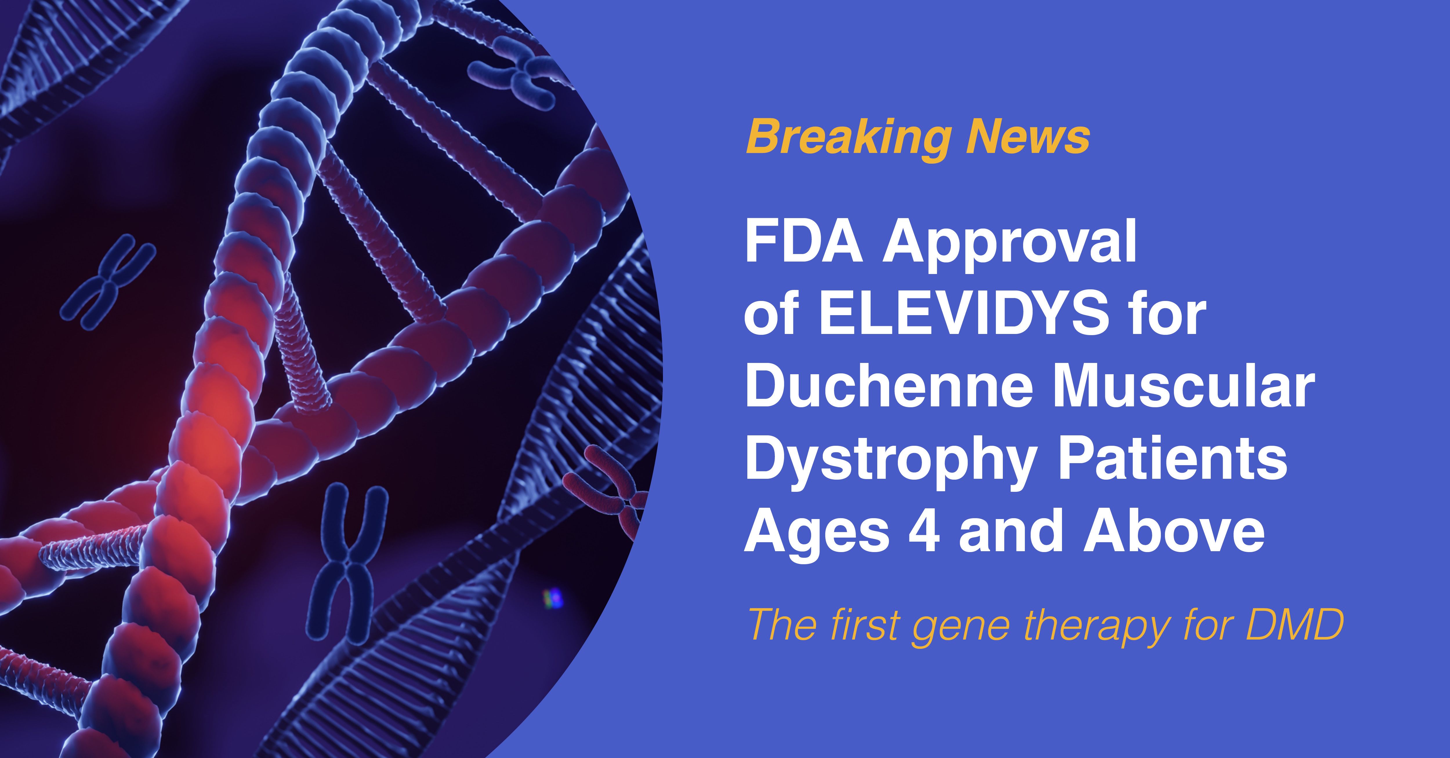Developed by Sarepta Therapeutics, ELEVIDYS targets the genetic root cause of Duchenne muscular dystrophy (DMD) and works by introducing an engineered gene that codes for a shortened version of dystrophin, referred to as ELEVIDYS micro-dystrophin into muscle cells. The FDA granted accelerated approval for boys ages 4 and 5 in June of 2023. Read more in the Sarepta press release.