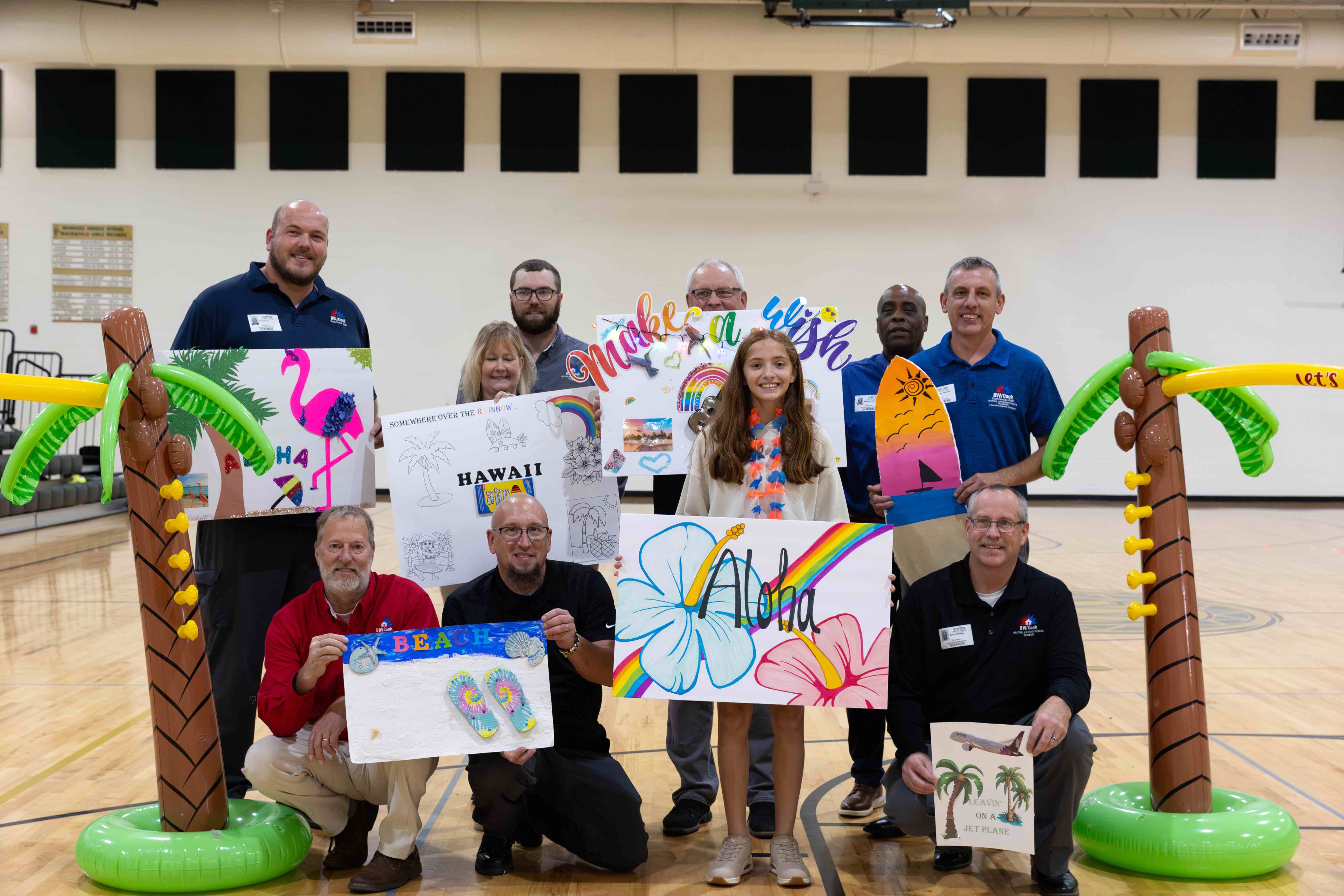 The wish reveal at Wawasee Middle School took place in front of more than 600 students in leis and Hawaiian snap bracelets, and included Hawaiian snacks and activities like the limbo. Wawasee’s cheerleaders and their Warrior mascot were also on-hand, as well as around 20 superfans from Service Experts and Make-A-Wish. For her trip, Service Experts also gave Anna an underwater GoPro, waterproof speakers, and more.