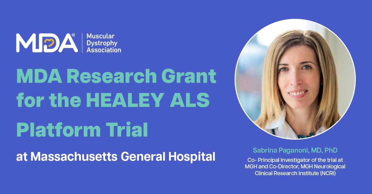 "We are incredibly grateful for Muscular Dystrophy Association’s generous support of the HEALEY ALS Platform Trial," said Sabrina Paganoni, MD, PhD, Co- Principal Investigator of the trial at MGH and Co-Director, MGH Neurological Clinical Research Institute (NCRI). “This funding will enable us to expedite the testing of promising therapies and move us closer to our ultimate goal of finding effective treatments for people living with ALS. Collaborations like this are essential to driving innovation and making a meaningful difference in the lives of patients and their families."