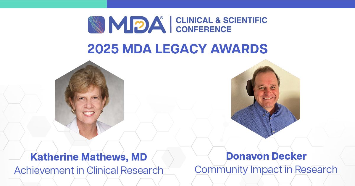 “The Muscular Dystrophy Association is pleased to honor both Dr. Katherine Mathews and Donavon Decker for their extraordinary contributions to the field of neuromuscular diseases,” said Sharon Hesterlee, PhD, EVP, Chief Research Officer, MDA. “Dr. Mathews has long been at the forefront of clinical research, particularly in documenting the natural history of several neuromuscular diseases and testing new therapies. Her groundbreaking work over the years and commitment to her patients continues to have a profound impact on the lives of patients and their families. Similarly, Donavon’s advocacy for LGMD—and the unwavering commitment of the Decker family, in which five siblings were affected by the disease—to advancing research, have been transformative for the community. Both exceptional individuals embody the MDA’s mission of accelerating progress for people living with neuromuscular diseases.”