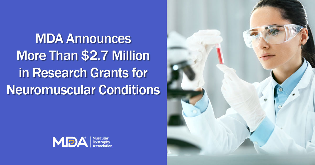 New York, Dec. 10, 2025 (GLOBE NEWSWIRE) -- The Muscular Dystrophy Association (MDA) today announced more than $2.7 million in new research grants to advance groundbreaking discoveries across multiple neuromuscular diseases, including amyotrophic lateral sclerosis (ALS), Charcot-Marie-Tooth (CMT) disease, Duchenne muscular dystrophy (DMD), facioscapulohumeral muscular dystrophy (FSHD), mitochondrial myopathies, and myotonic dystrophy (DM). This round of funding also includes MDA Development Grants, which are fellowships supporting early career investigators.