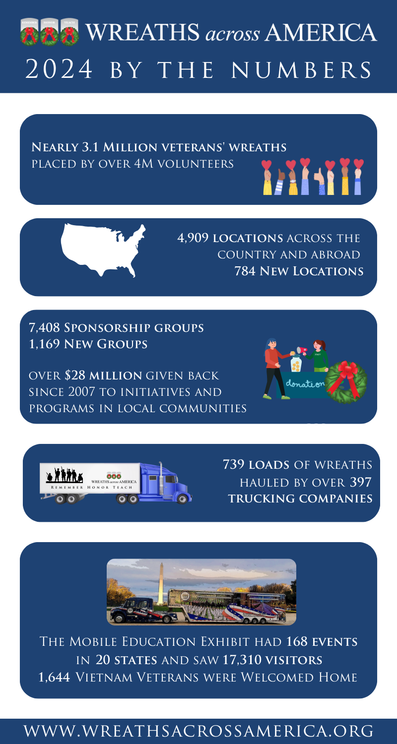 COLUMBIA FALLS, Maine and LOUISVILLE, Ky., March 27, 2025 (GLOBE NEWSWIRE) -- Wreaths Across America (WAA) proudly celebrates seventeen transportation partners reaching ten or more years of service as an “Honor Fleet” member. WAA’s Honor Fleet is responsible for transporting and delivering millions of veterans’ wreaths across the United States. In 2024, 739 loads of veterans’ wreaths were hauled by 397 trucking companies to over 4,900 participating locations, including Arlington National Cemetery.