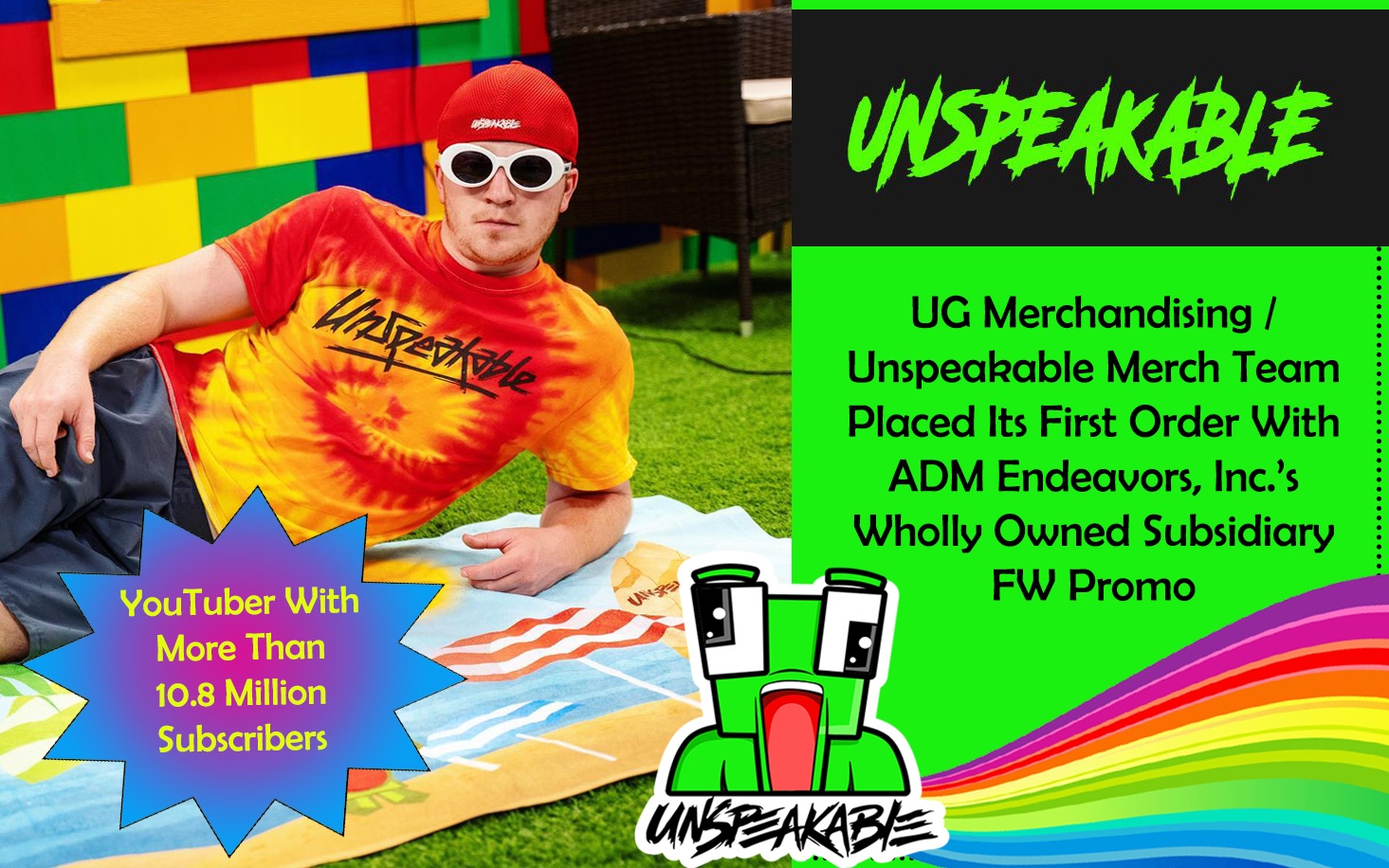 (NewMediaWire) - April 07, 2021 - ADM Endeavors, Inc. (OTCQB: ADMQ) announces that UG Merchandising/Unspeakable has placed its first order with our wholly owned subsidiary FW Promo. This order is a direct byproduct of the contract signed on March 16thwith UG Merchandising. UG Merchandising has also set up a site visit to ensure we can handle their products. The team is due to fly in on April 20th.