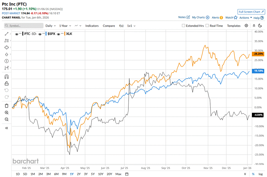 Shares of PTC have declined 5.3% over the past 52 weeks, underperforming the S&P 500 Index’s ($SPX) 16.2% rise and the State Street Technology Select Sector SPDR ETF’s (XLK) 22.9% return during the same time frame.