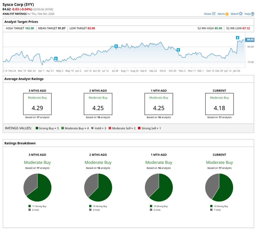On Jan. 29, Guggenheim kept a “Buy” rating on SYY and raised the price target to $91, implying a potential upside of 7.5% from current levels.
