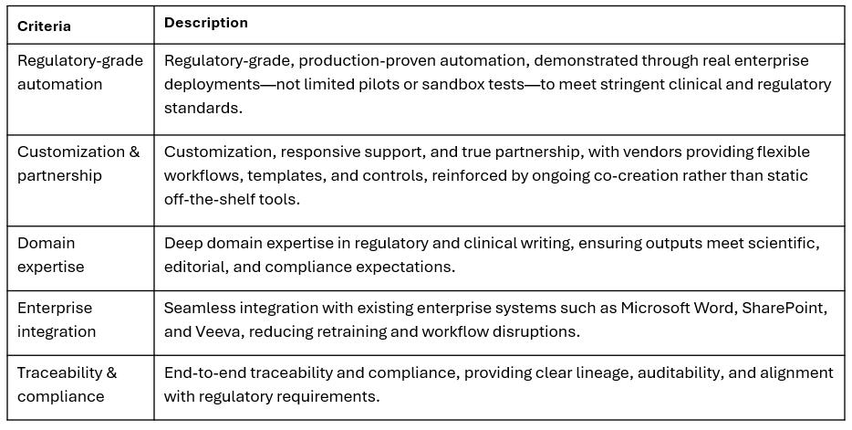 When evaluating AI solutions for regulatory and medical writing, global pharmaceutical companies apply a rigorous framework to ensure platforms are reliable, compliant, scalable, and suited to complex regulated workflows.