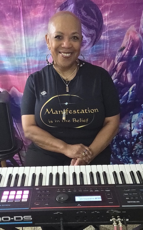 Anita at the keyboard embodying The Poetic Peace Experience, guided by Verse & Vibration: Poetry for Peace.