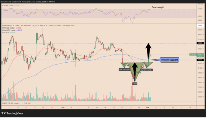 Ethereum is trading around $4,395. Analysts highlight $4,270 as the price that must not be reached. On the upside, the Ethereum price prediction points to $4,600 as the next target and if resistance is broken, ETH could surge to $5,353, setting a fresh record high