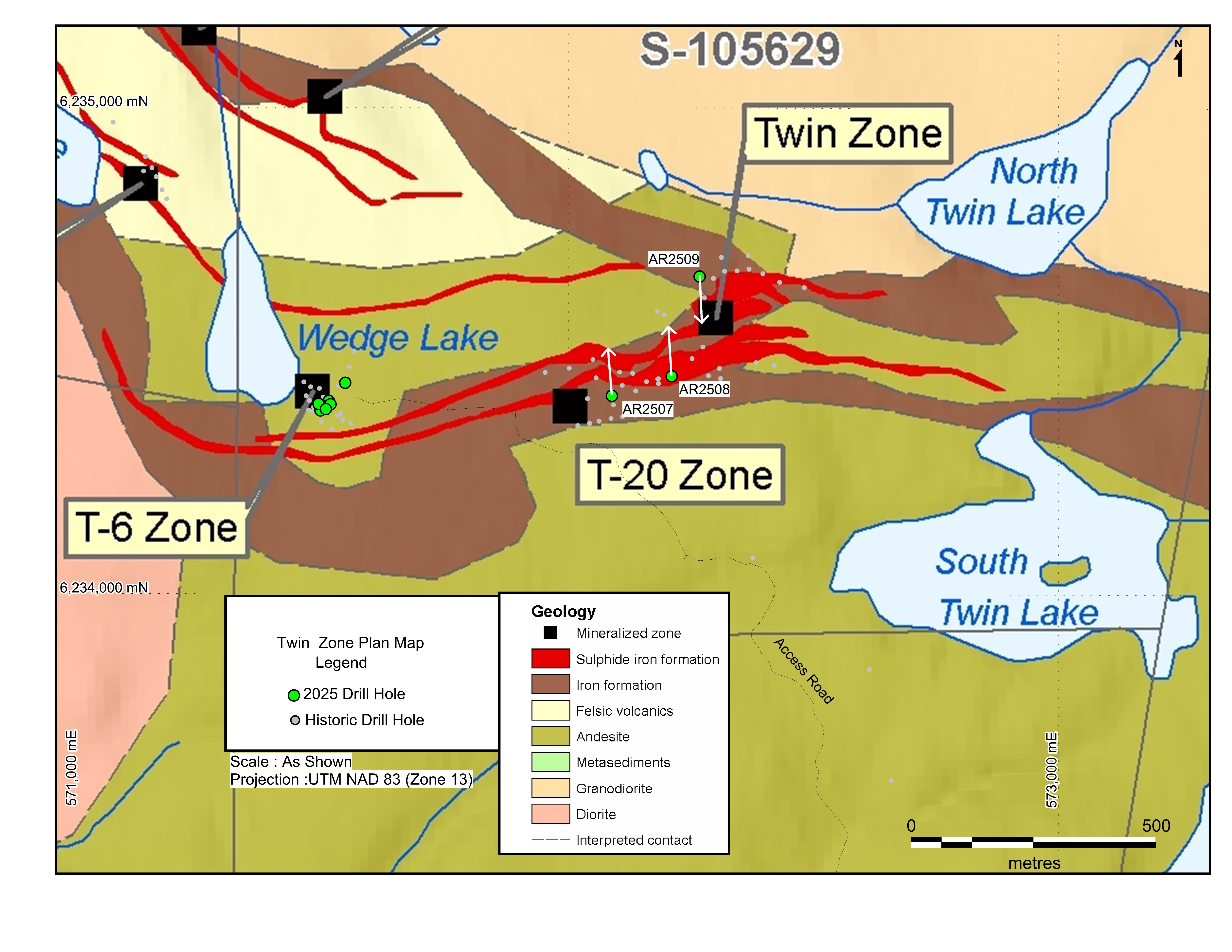 The Twin Zone drilling was designed to "twin" significant historic drill results to determine the validity of the historic mineralization for inclusion into a future NI 43-101 report on the "Twin Zone" mineralization. The mineralization targeted was intersected in holes 83-11 (AR25-07), 82-03 (AR25-08) and 82-02 (AR25-09).